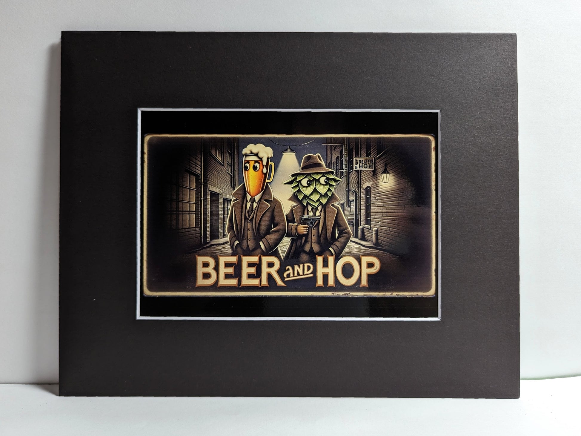 Matted photographic print featuring Beer and Hop on a noir detective movie poster. Original art and characters created by Heather Short and AI. Fits in an 8" x 10" frame.