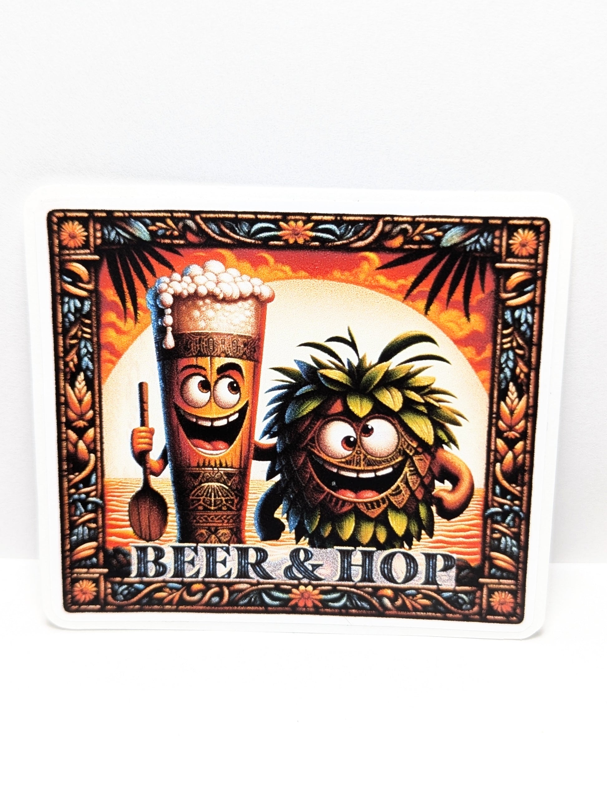 A 3.0” x 2.61” die-cut vinyl sticker featuring Beer and Hop, an adventurous duo voyaging into your heart. Printed by Jiffy. Wear, scratch, and water resistant. Suggested uses: decorating personal items like drinkware, phone cases, or suitcases