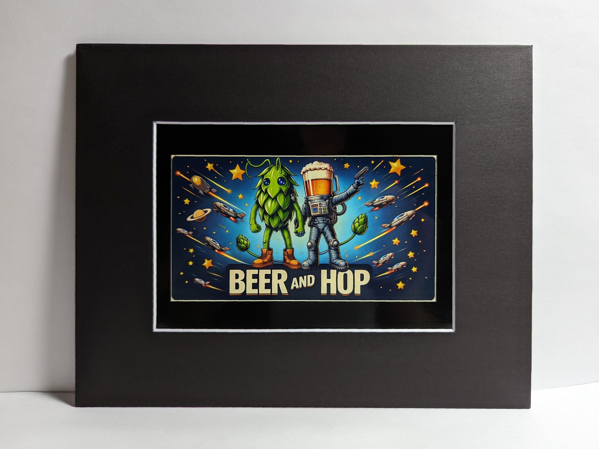 Matted photographic print featuring Beer and Hop on a spaceship movie poster. Original art and characters created by Heather Short and AI. Fits in an 8" x 10" frame.
