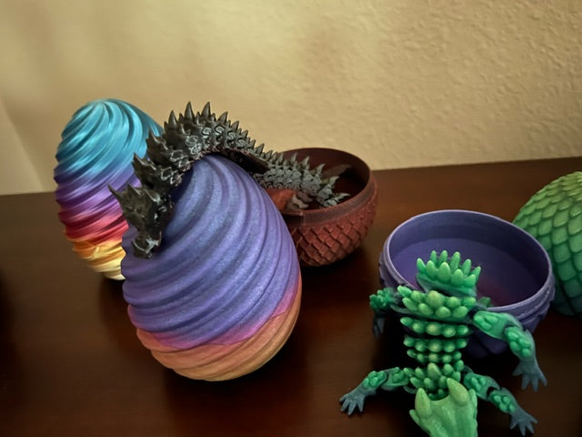 Description : Dragon egg containing up to 11-inch articulated dragon, 3D printed sensory stress fidget item. Eggs and dragons vary. Colorful and hours of fun for all.