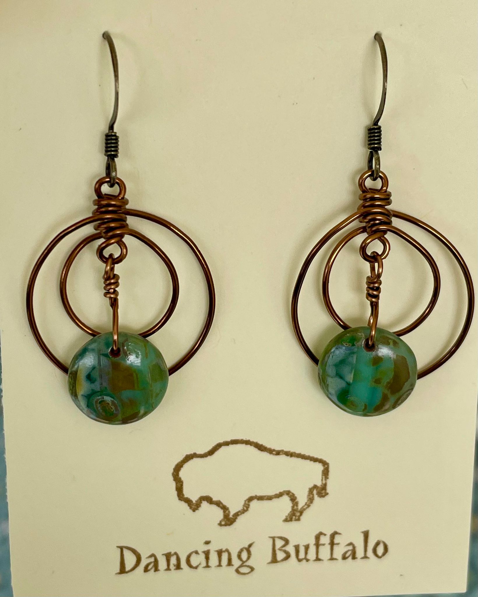 Green Czech Glass Double Circle Wire Wrapped Earrings