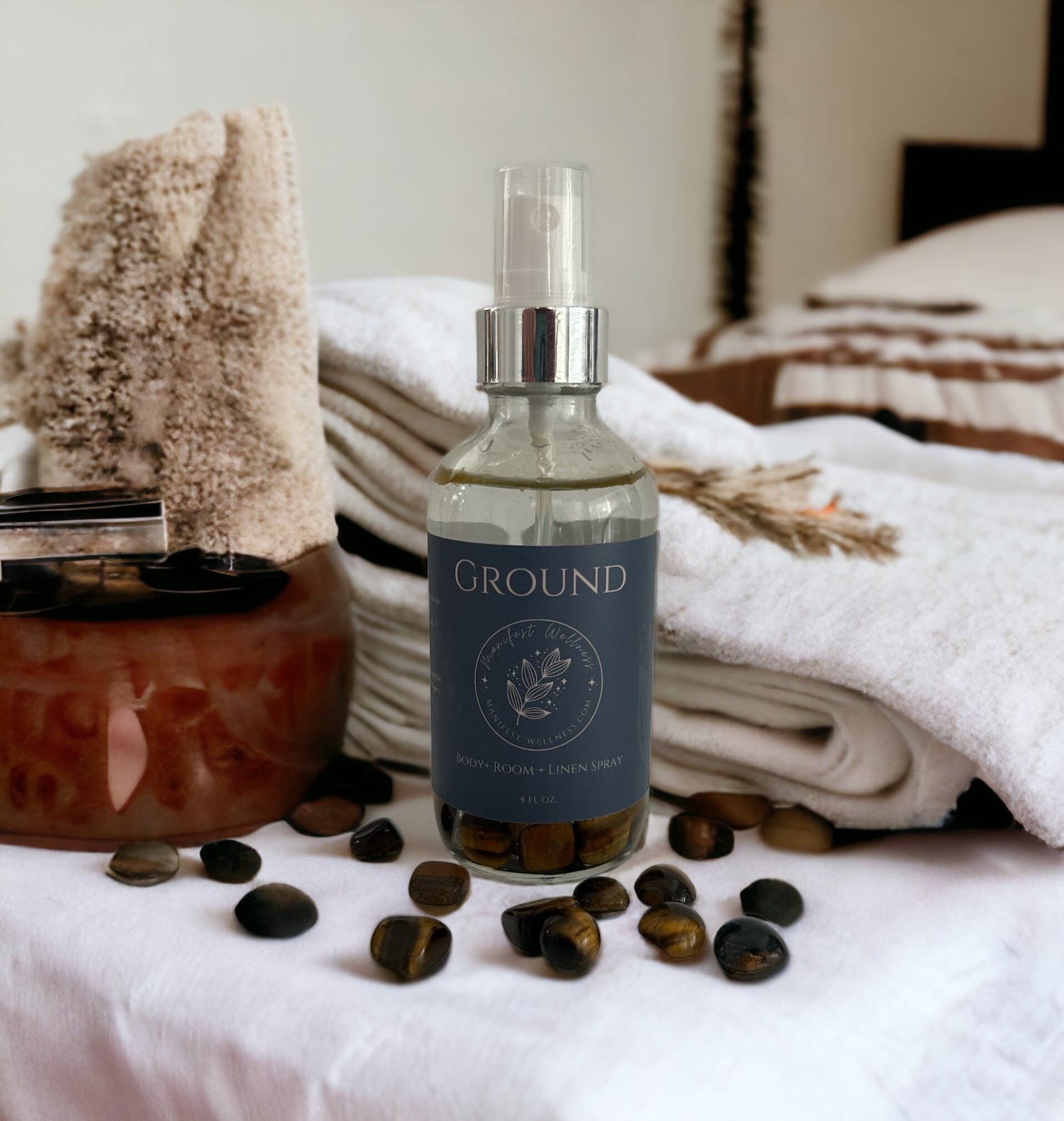 Elevate your space and embrace a sense of balance with Ground Aromatherapy Spray. Perfect for daily use or as a supportive tool for meditation and relaxation. Center your energy with the harmonious blend of essential oils and the powerful presence of tiger’s eye. Expertly formulated to ground and uplift, this premium spray combines the therapeutic benefits of sandalwood, ylang ylang, orange, and patchouli essential oils with the powerful energy of tiger’s eye crystals.