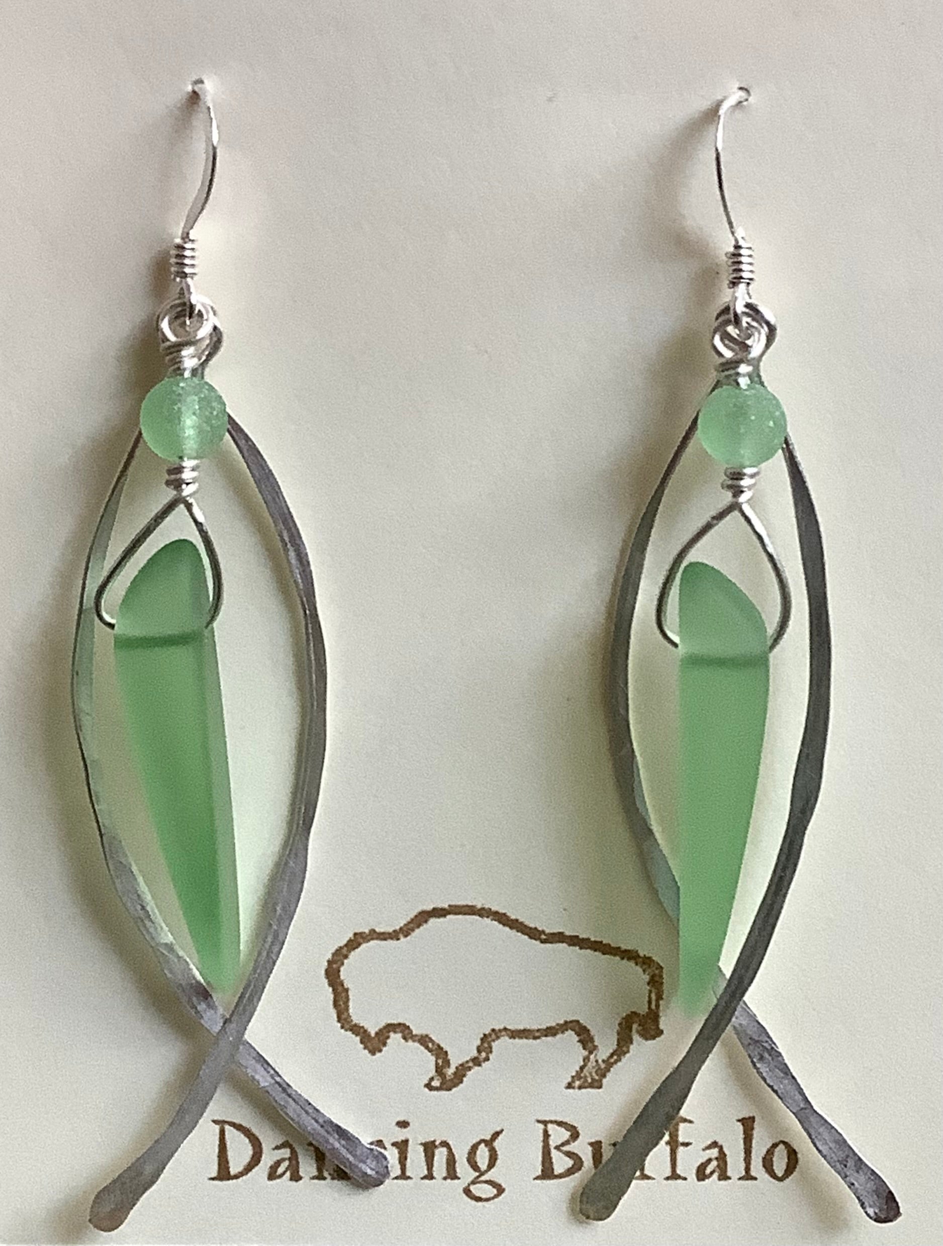 These handcrafted earrings feature sea glass beads, hammered wire, and sterling silver ear wires. All materials are nickel free.