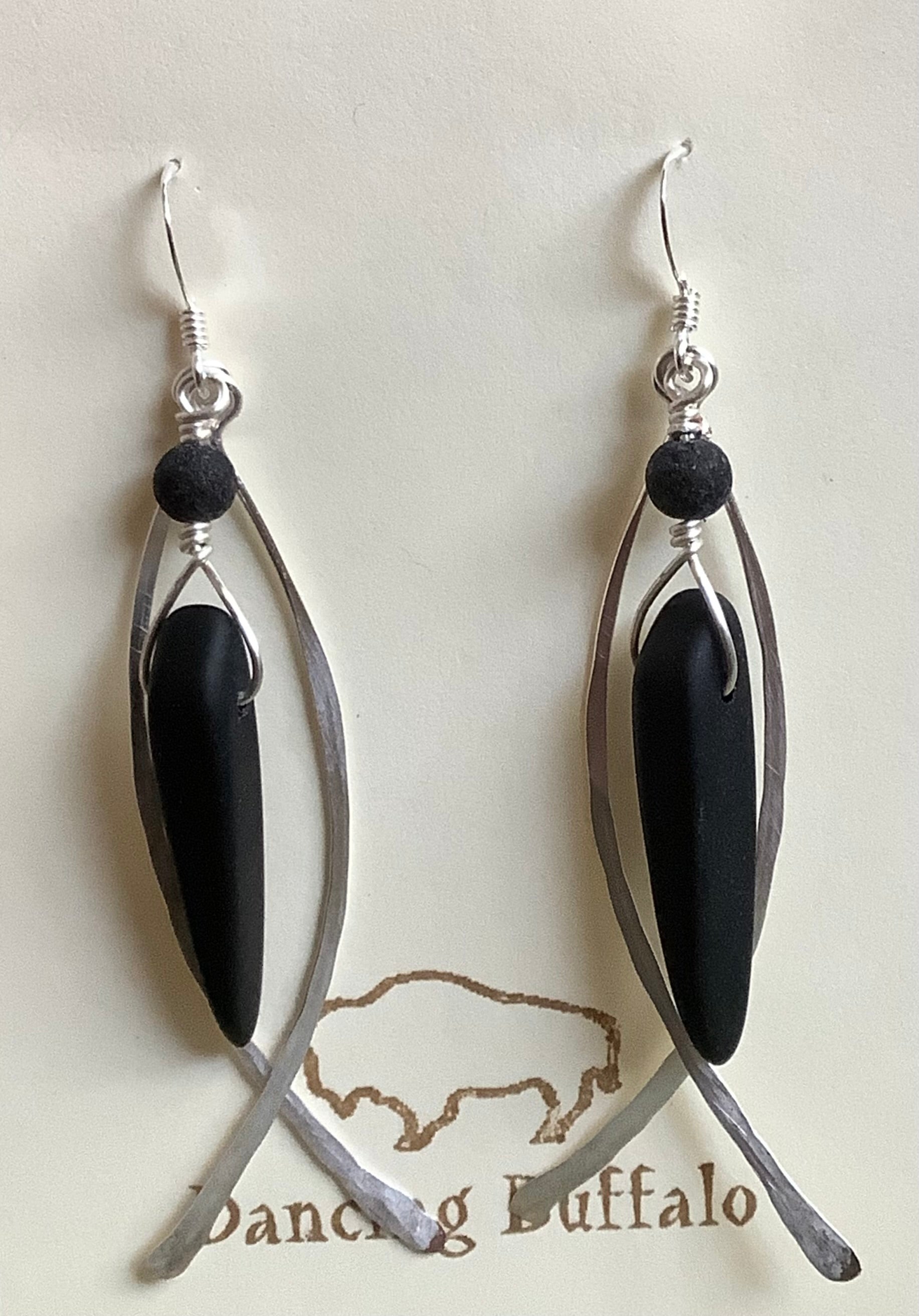These handcrafted earrings feature sea glass beads, hammered wire, and sterling silver ear wires. All materials are nickel free.