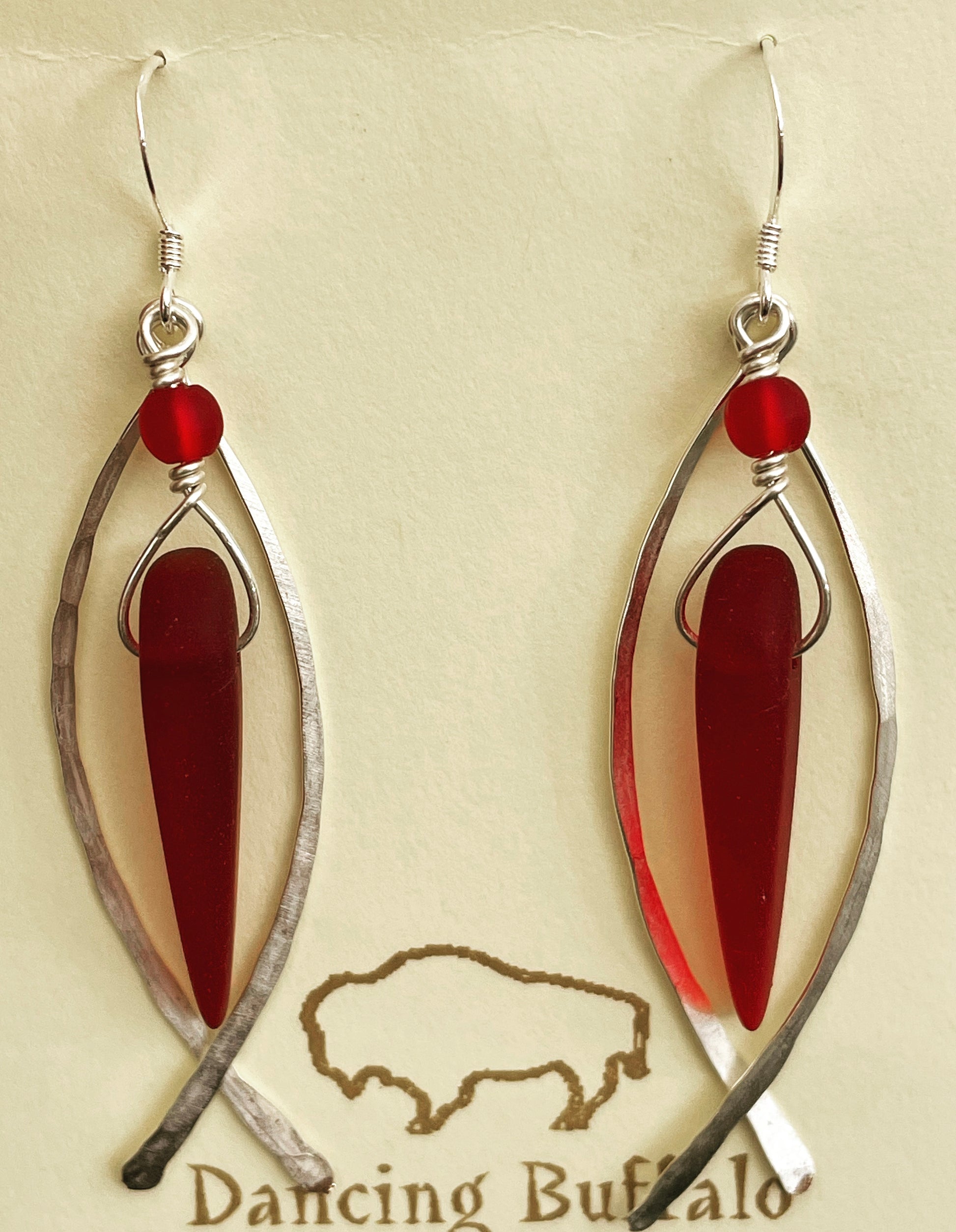 These handcrafted earrings feature sea glass beads, hammered wire and sterling silver ear wires. All materials are nickel free.