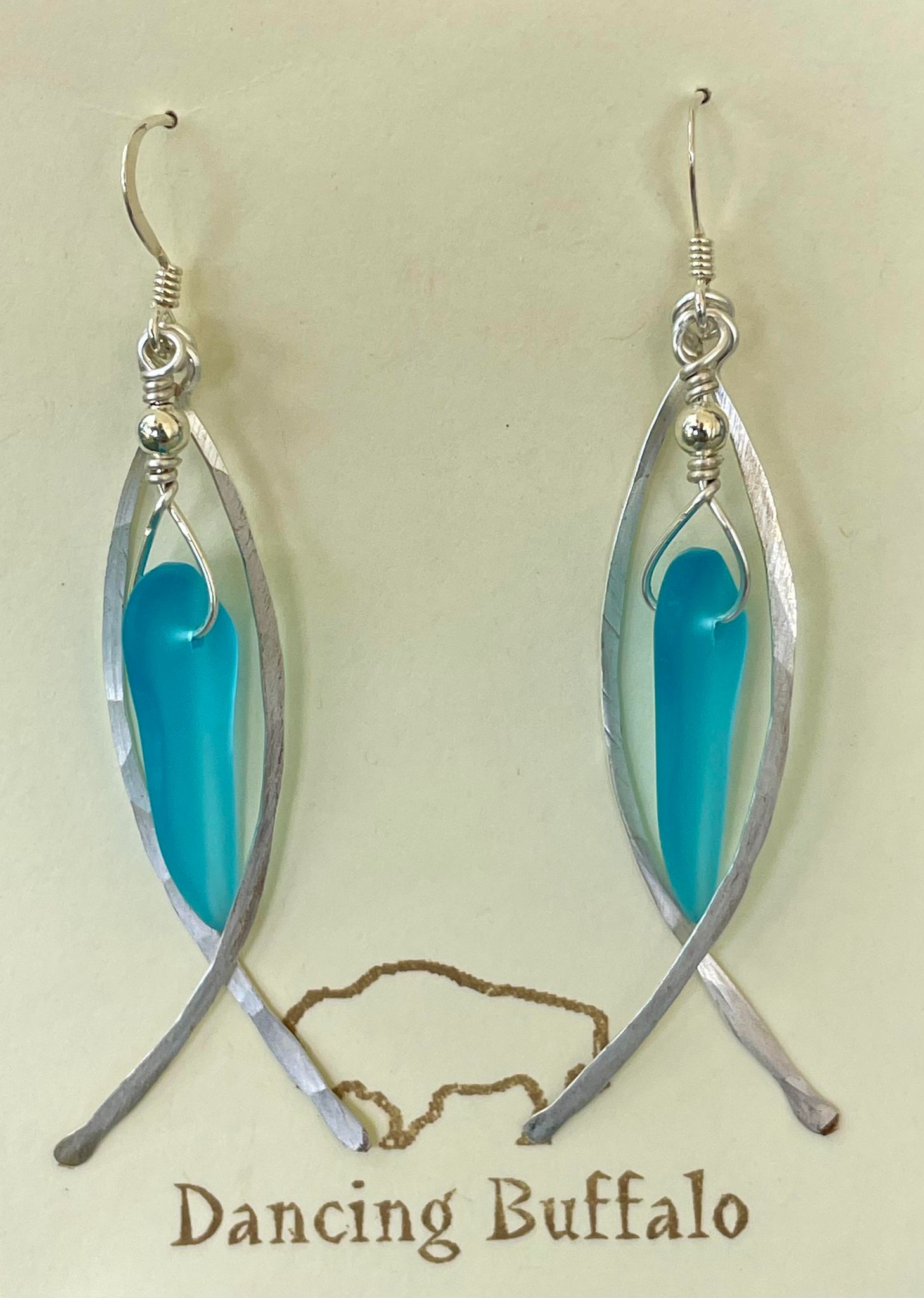 Hammered Wire Sea Glass Earrings-Aqua