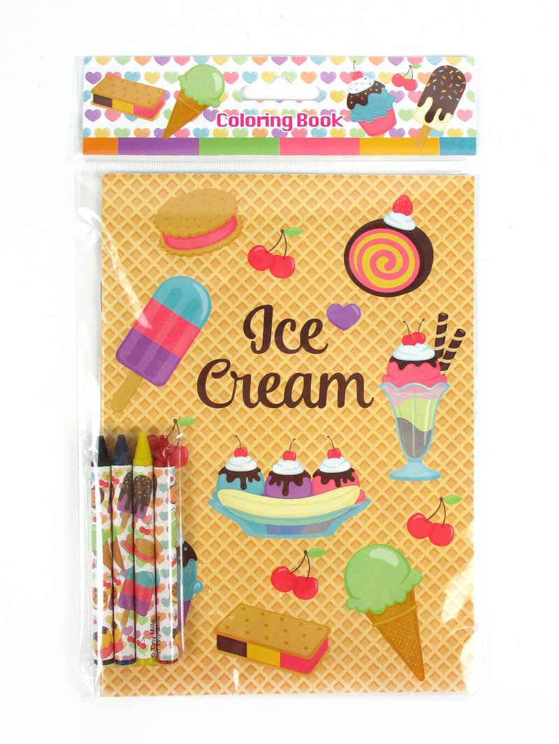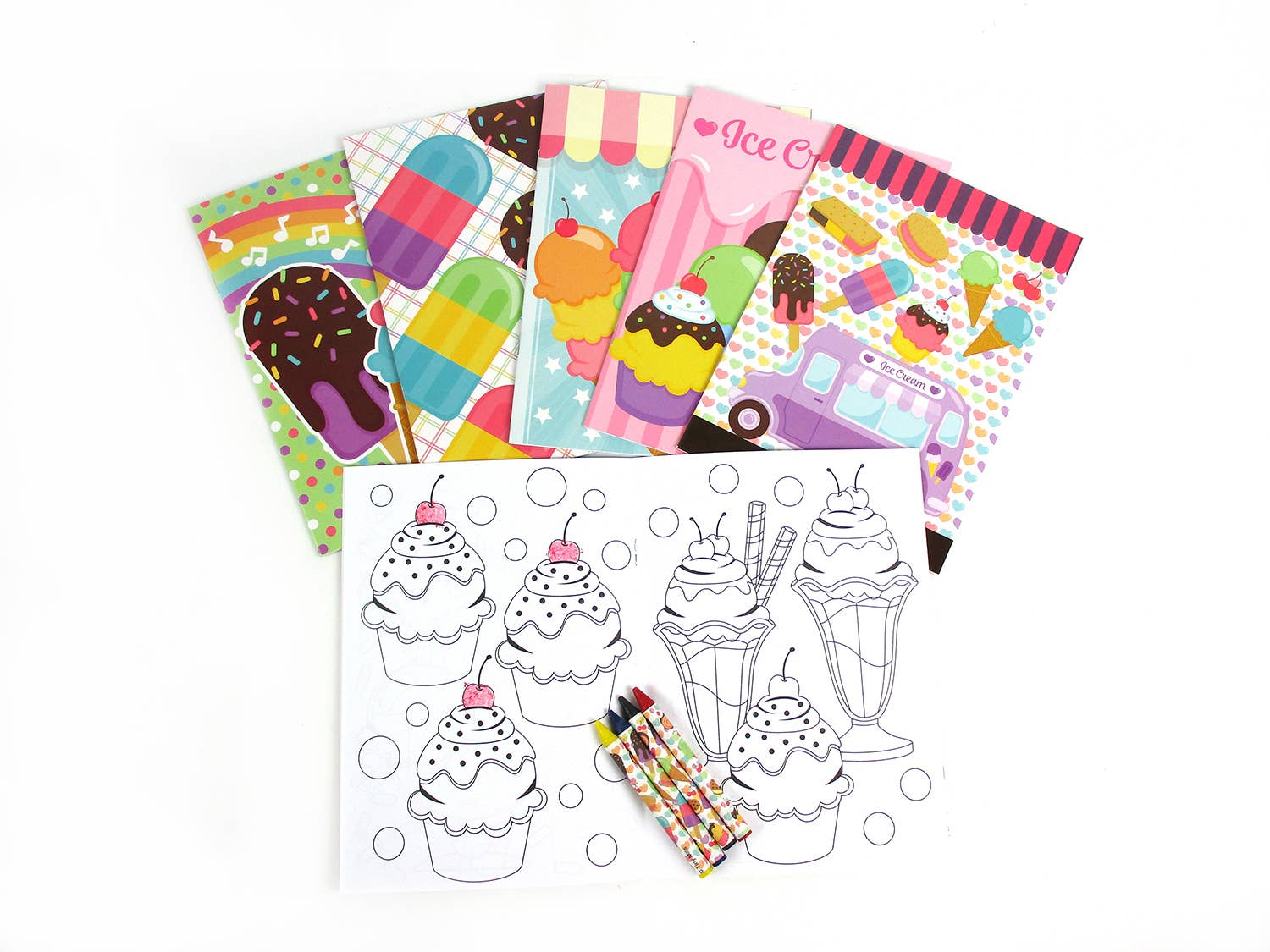 Celebrate an ice cream birthday party with cute coloring books! Great home school coloring activity to say Each ice cream themed coloring book comes with 16 pages and 4 crayons. The coloring books are compact enough for road trips, plane trips! Combine this with our ice cream goody bags! Have these coloring books in school, at home, or in art class! Each booklet measures appx 9 inches tall, 7 inches wide. Please note, cover designs vary, but each color pages are the same.