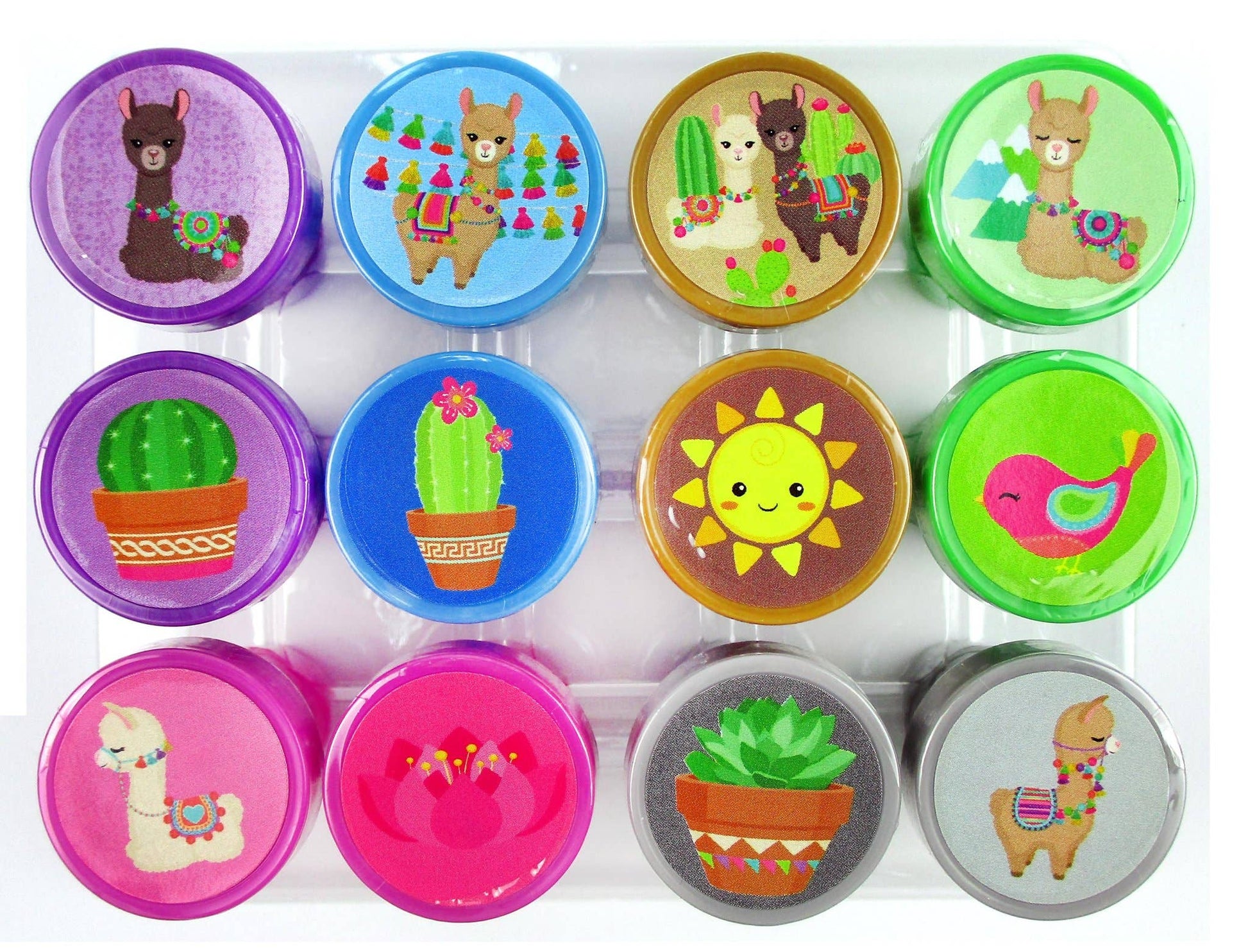 A cute stamp kit for the llama lover. This llamas 12 pc self-inking stamper comes with 12 different designs, stampers come in a cute plastic reusable box. Stamper measures 1.5 inches tall, 1 inch in diameter. Plastic box measures 4.75 x 4 x 1.5 inches appx.