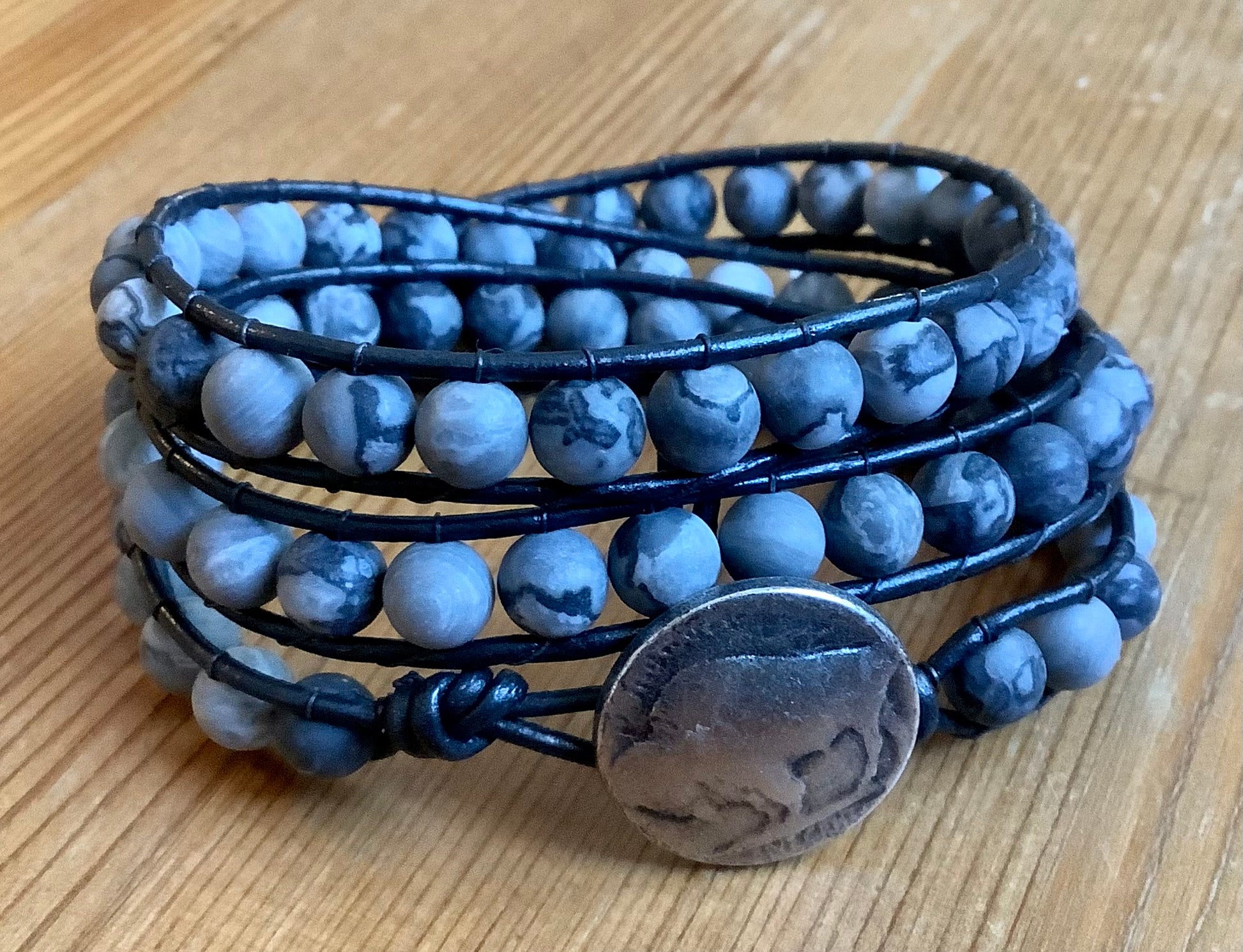 This handcrafted triple wrap bracelet is made from genuine map jasper beads, leather cord, and features a button and loop closure.