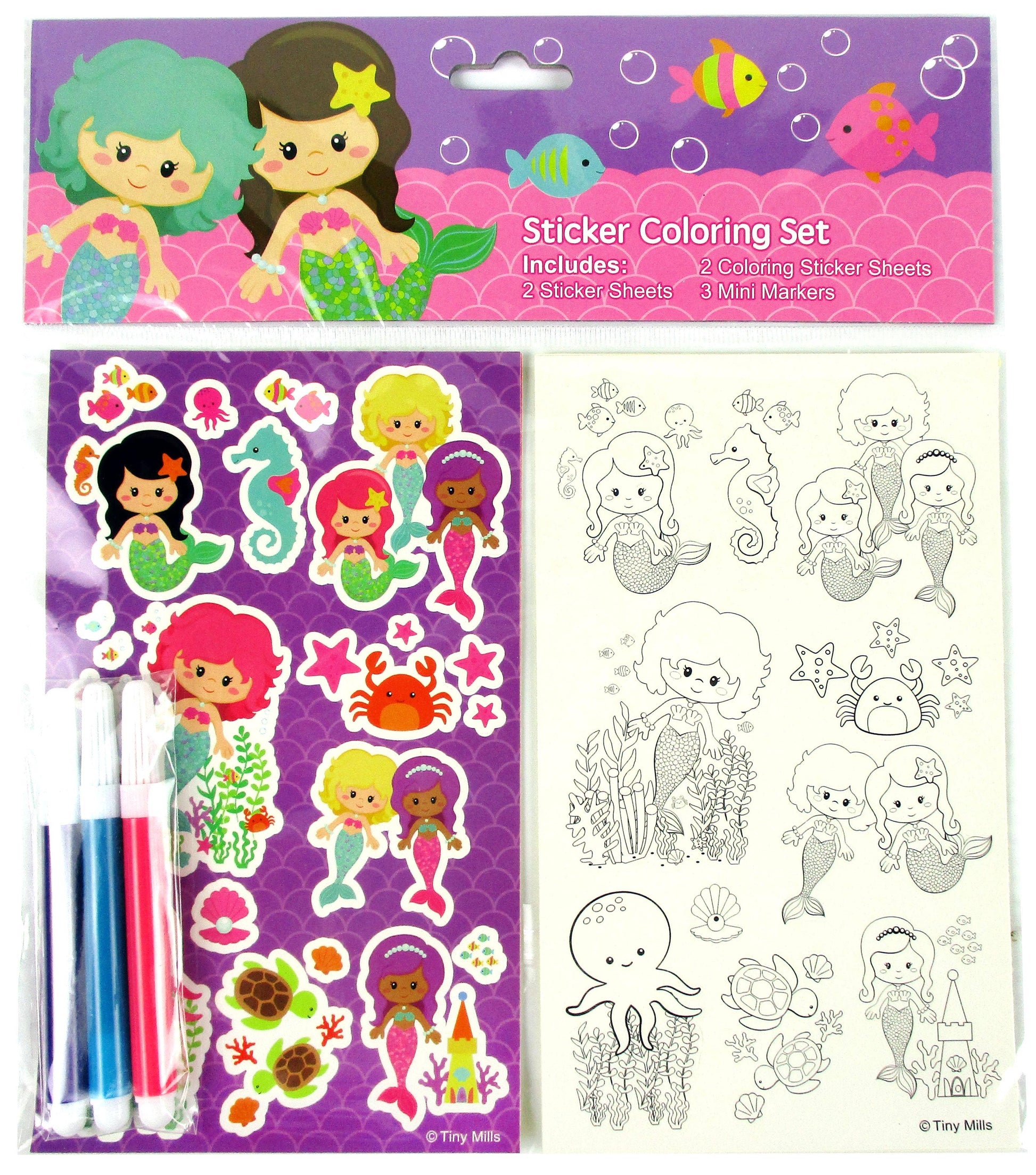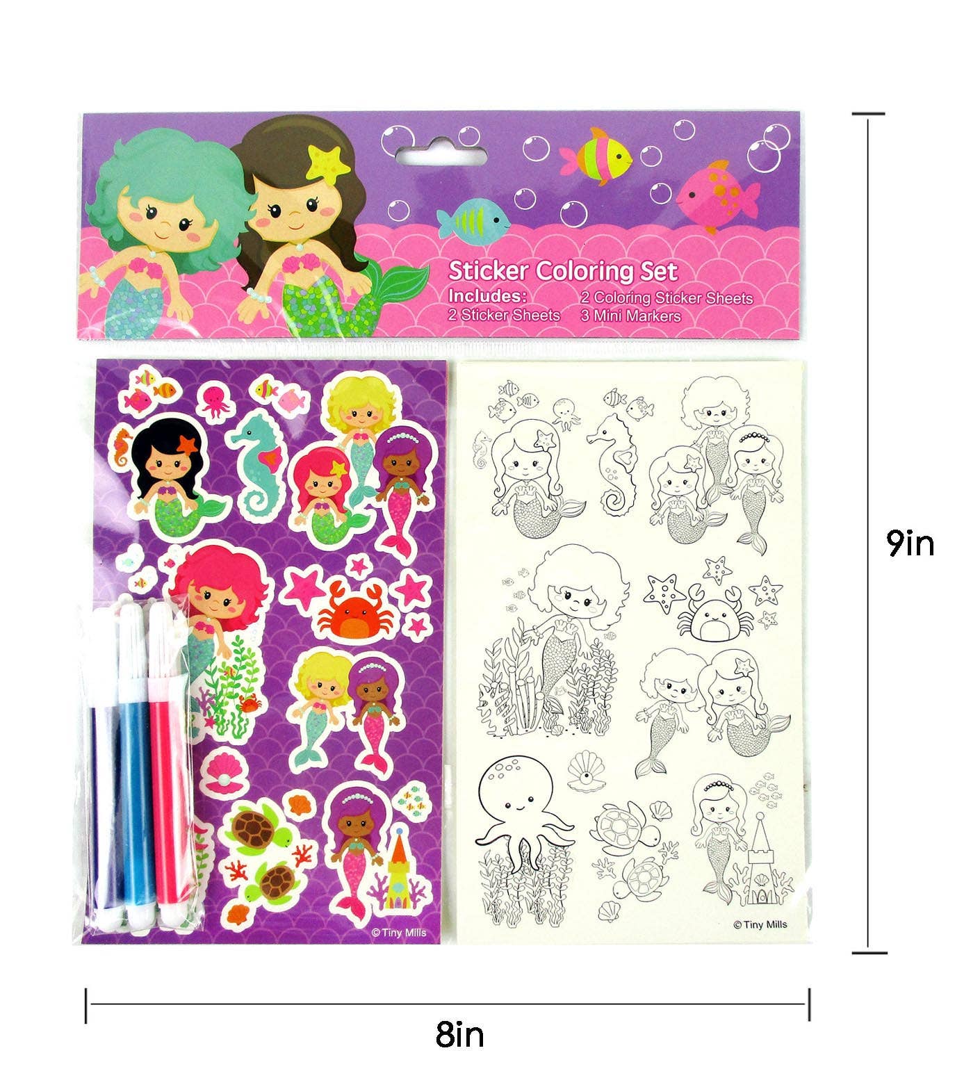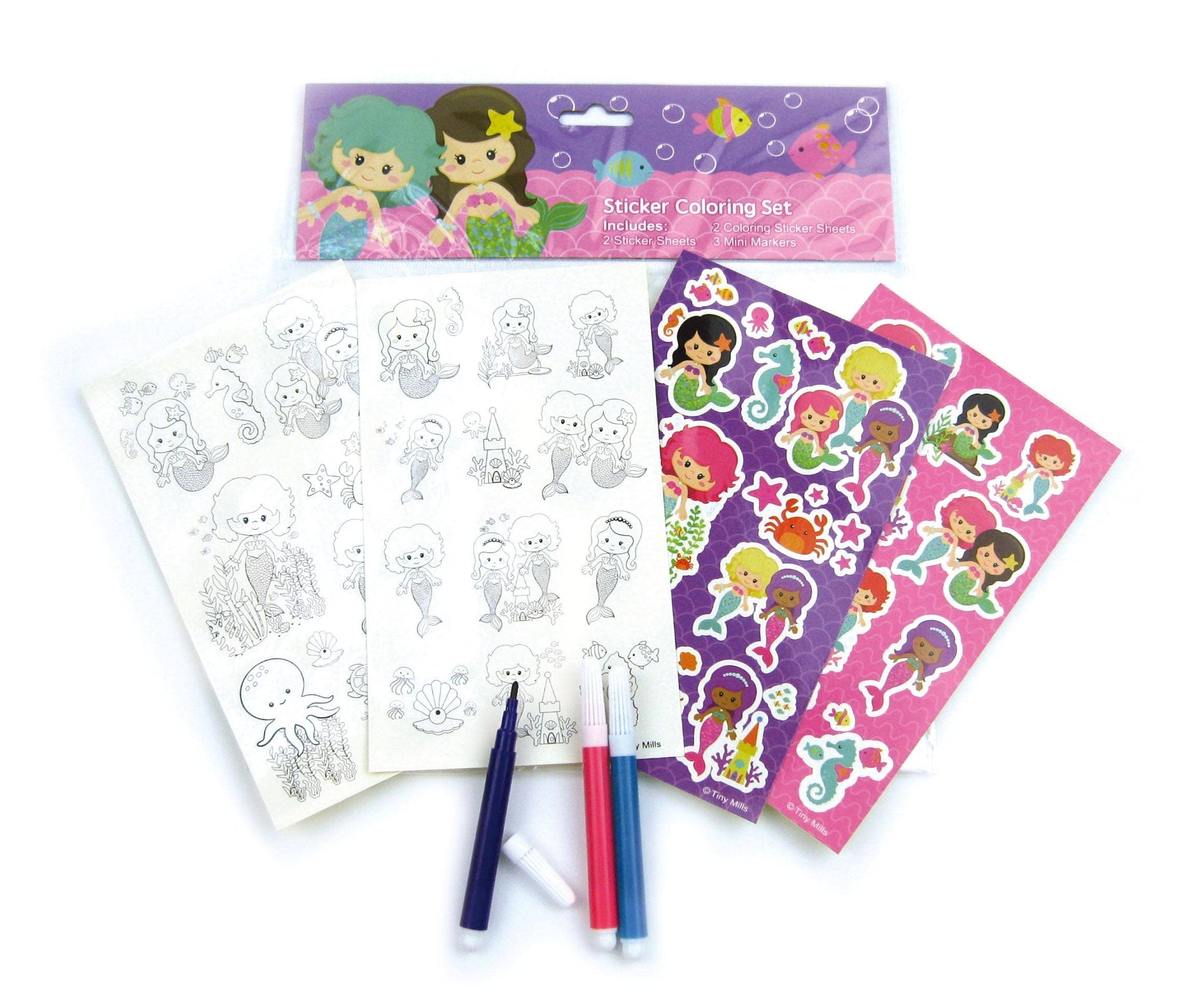 Great Mermaid and under the sea art and craft activity! Each Pack consists of 2 Sticker Sheets, 2 Coloring Sticker Sheets as well as 3 Mini Markers and make great party favors or classroom rewards. Have these Color-in Sticker Sets in school, at home, or in art class!