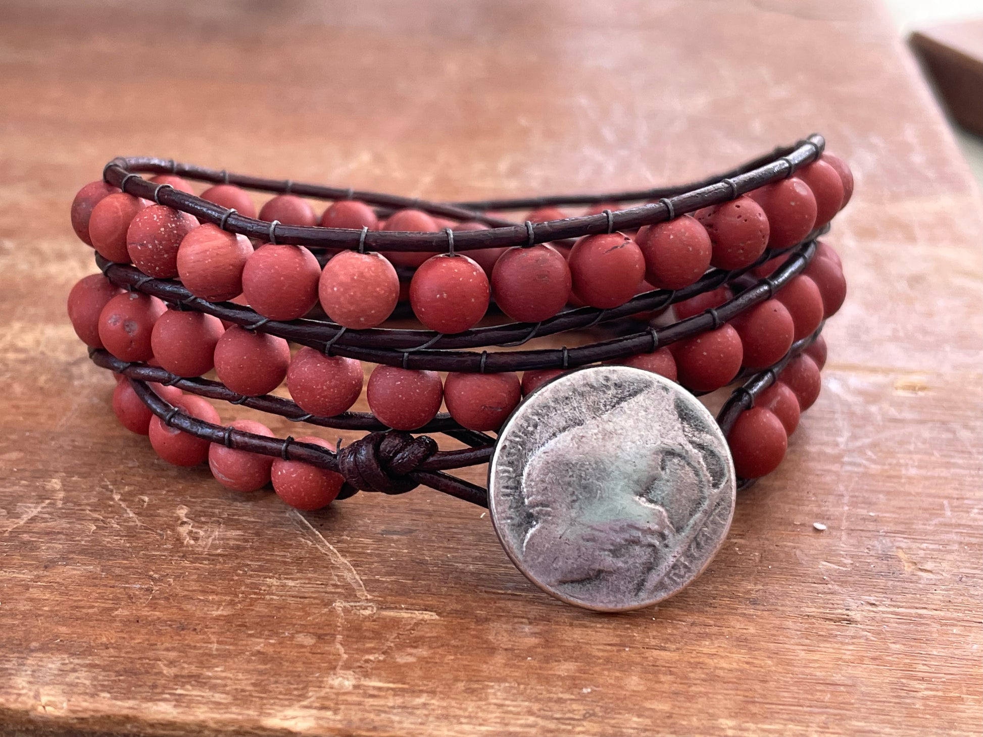 This handcrafted triple wrap bracelet is made from genuine red river jasper beads, leather cord, and features a button and loop closure.