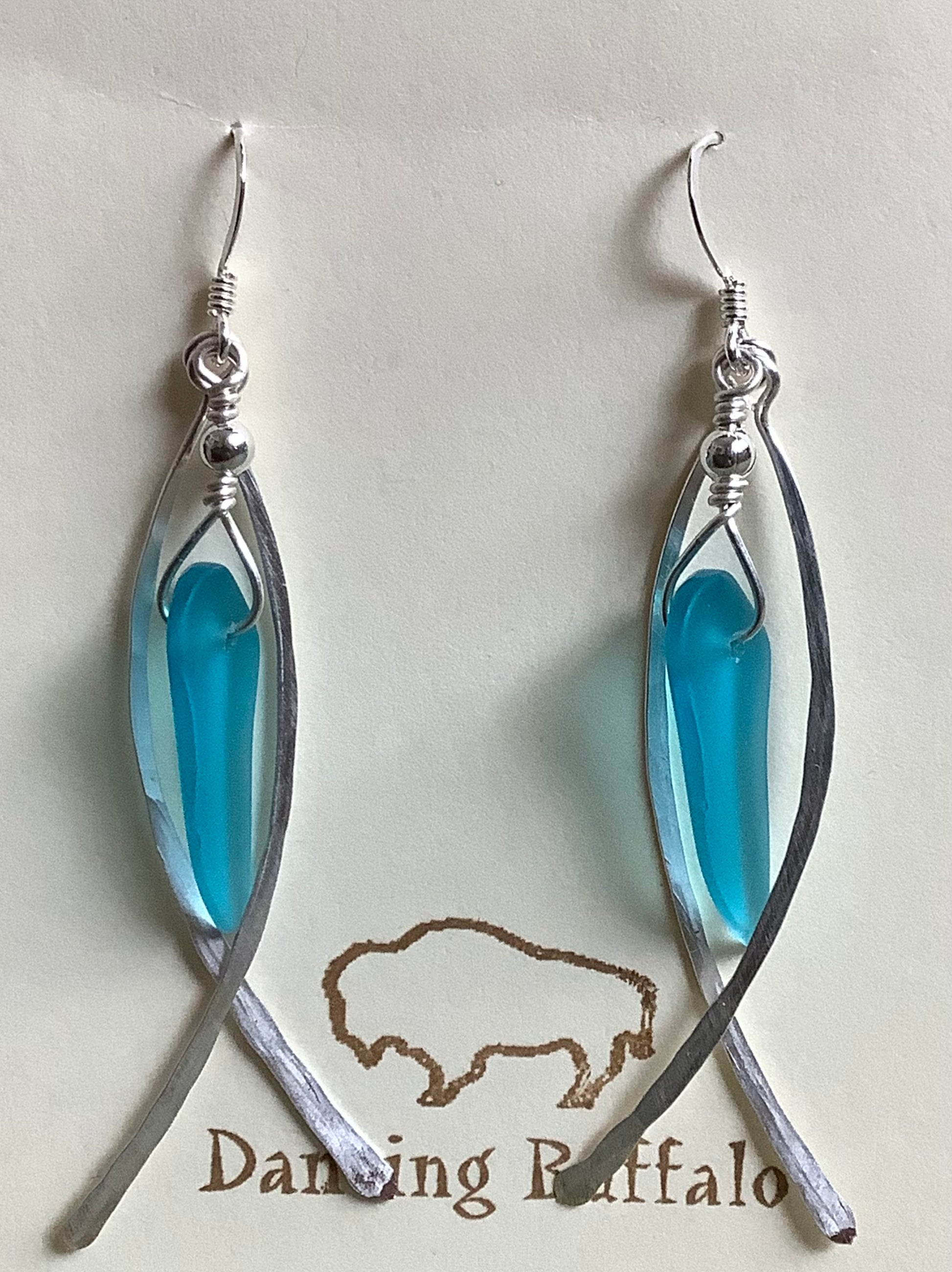 These hand-crafted wire-wrapped earrings are made with sea glass beads and sterling silver ear wires. All materials are nickel-free.